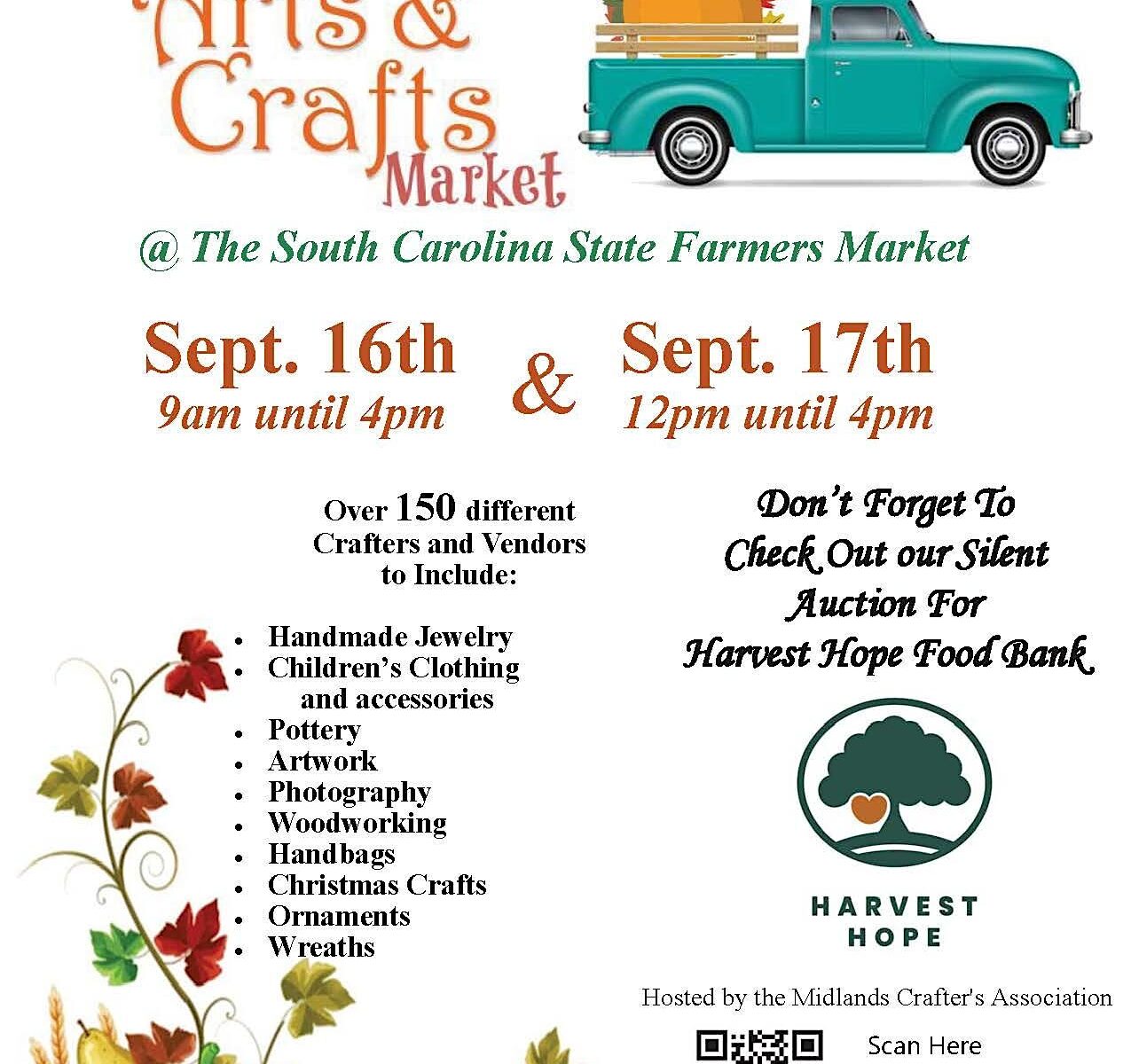 The Midland’s Crafters Association in conjunction with the SC State Farmers Market present the annual 2023 Midlands Fall Arts & Crafts Market Extravaganza with Silent Auction to benefit Harvest Hope Food Bank. Over 170 Crafters and Vendors from all over the Midlands will be showcasing their talents and creations. You can get a jump start on sprucing up your home décor for your upcoming family gatherings or find that personal gift for someone special. It’s never too early to think about Christmas shopping! Come shop locally and find lots of unique gifts for every occasion. FREE PARKING FREE ADMISSION Saturday September 16h from 9am until 4pm and Sunday September 17th from 12pm-4pm