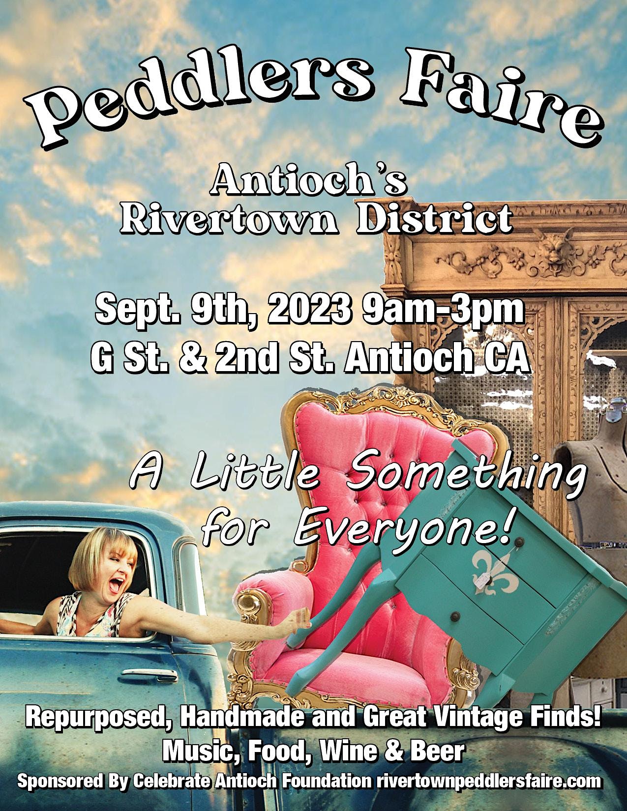 Join us Sept 9th for a Fun Day in Antioch’s Historic Rivertown Business District! We Have over 75 Vendors Offering Vintage Goods, Antiques, Furniture, Home Decor, Repurposed & Upcycled Items, Home & Garden, Handmade Items, Arts & Crafts, Jewelry & Gifts and So Much More! We have Live Music, Food , Beer & Wine and Great Shopping Fun! This is a Family Friendly, Community Event! Admission and Parking is Free! We’ll See You at The Rivertown Peddlers Faire!