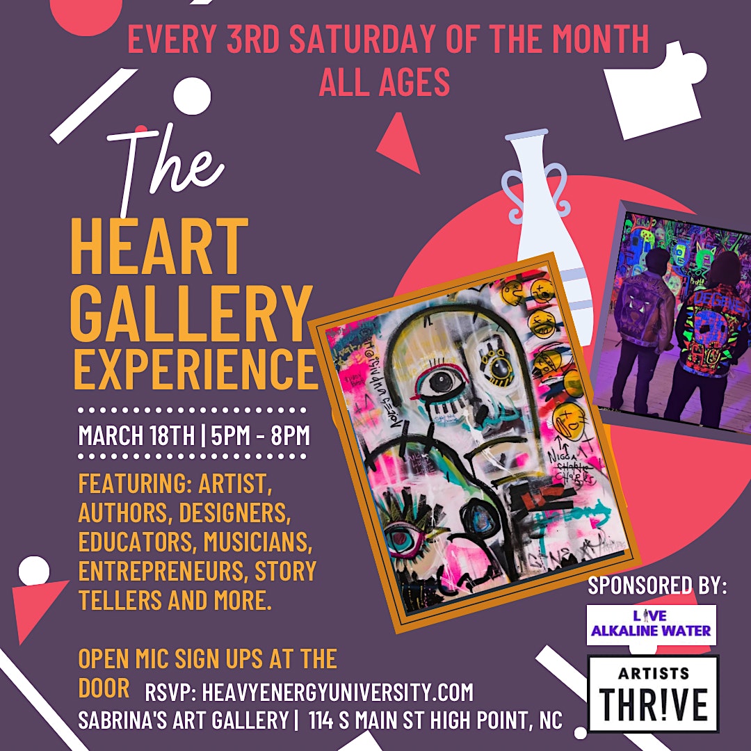 The HeART Gallery is a family friendly visual and performing arts experience occurring every 3rd Saturday of the month. We feature poets, authors, story tellers, musicians, entrepreneur, etc at Sabrina’s Gallery on Main in High Point NC. Sponsored by Artist Thrive, Live Alkaline Water, S.O.U.L. Society & Heavy Energy this experience is memorable for everyone.