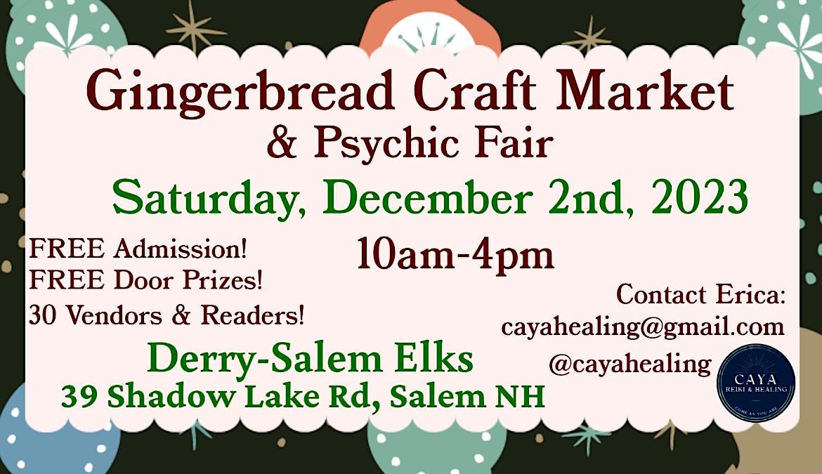 Derry-Salem Elks #2226 39 Shadow Lake Road, Salem, NH, United StatesJoin us at the Derry-Salem Elks for the Gingerbread Craft Market & Psychic Fair, hosted by CAYA Reiki & Healing!Come join us on Saturday, December 2nd, for the Gingerbread Craft Market & Psychic Fair at the Derry-Salem Elks!!Over 30 vendors, readers, crafters, artists, and more welcome you to a fun-filled day of family Holiday shopping! …