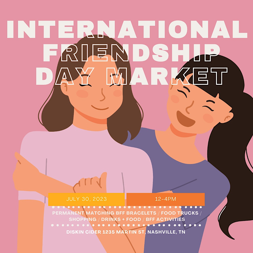 Diskin Cider 1235 Martin Street, Nashville, TN, United StatesA BFF THEMED MARKET: matching permanent jewelry, tattoos, shopping, BFF activities, drinks, food + so much more!Come celebrate International Friendship Day with your BFF! The market will be FULL of fun things to do including getting matching permanent bracelets, matching tattoos, shopping for clothing, accessories, and home goods, delicious ciders + beers on tap, food, …