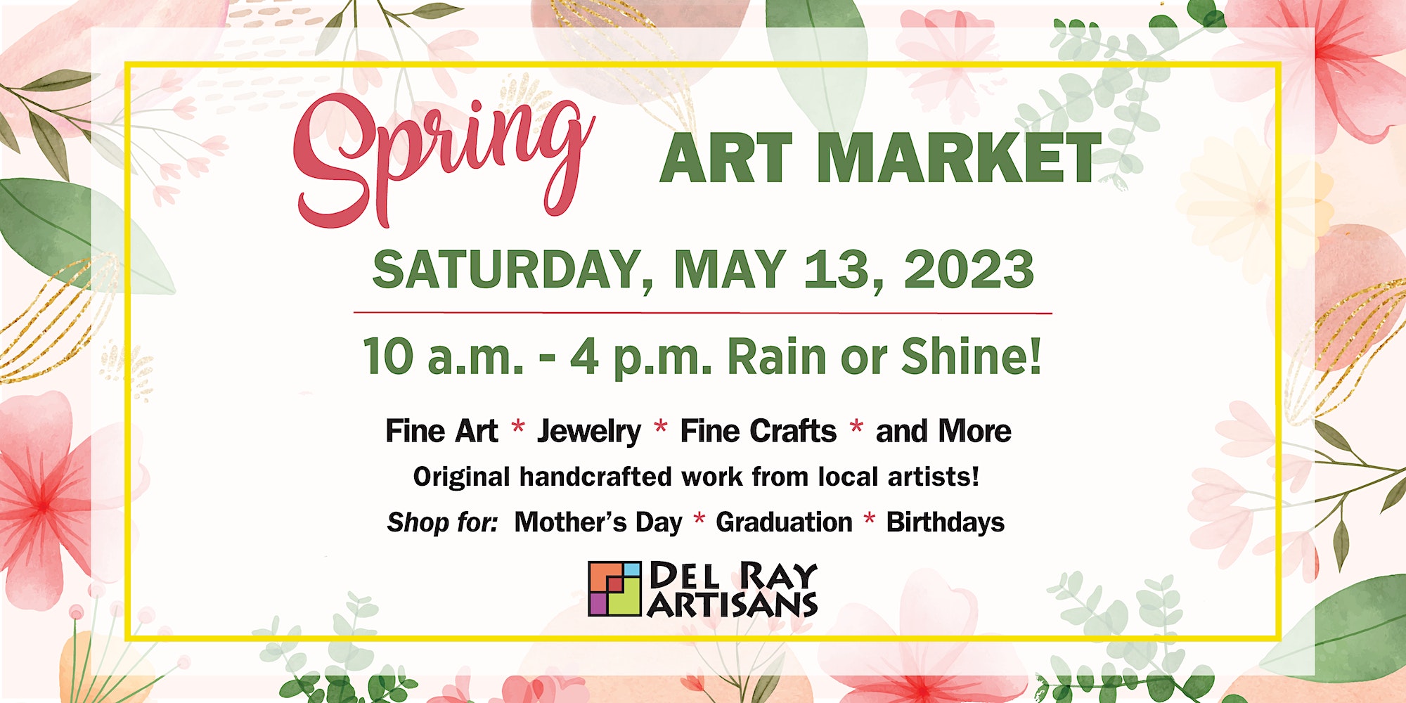 8 events found. Events Search and Views Navigation Search Enter Keyword. Search for Events by Keyword. Find Events Event Views Navigation Photo List Photo Today 2023-05-13 May 13, 2023 Select date. Condense Events Series May 13 10:00 am - 4:00 pm The Goddess Mercado Artisan Flea Market in East Los Angeles May 13 10:00 am - 4:00 pm Huntington Woods Art & Garden Fair May 13 10:00 am - 4:00 pm Vintage and Handmade Market in Brownstown – Over 100 Small Businesses May 13 10:00 am - 4:00 pm Artisan Market – Mothers Day – Denver Yoga Social May 13 10:00 am - 4:00 pm SPRING Horseshoe Market at Regis University Campus May 13 10:00 am - 4:00 pm Spring Art Market (Outdoor, RAIN or SHINE!) May 13 10:00 am - 4:00 pm Spring Craft Fair May 13 10:00 am - 7:00 pm SIGN UP TO WIN $100 IN ART BUCKS! Spring Lincoln Roscoe Art + Craft Fair Previous Events Today Next Events Subscribe to calendar Google Calendar iCalendar Outlook 365 Outlook Live Export .ics file Export Outlook .ics file