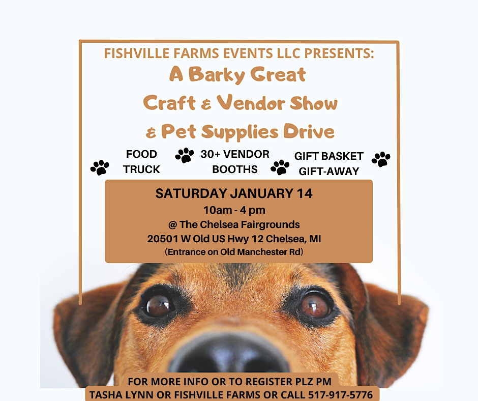 Chelsea Fairgrounds 1434 OLD MANCHESTER RD, CHELSEA, MI, United StatesA Barky Great Craft/Vendor Show & Pet Supplies Drive Come on down and support a great cause!Fishville Farms Events LLC is hosting A Barky Great Craft/Vendor Show & Pet Supplies Drive! ⏰️10am - 4pm ✉️Chelsea Fairgrounds 20501 W Old US Hwy 12 Chelsea MI Food Truck Lunch TBD 🎟FREE ADMISSION/FAMILY FRIENDLY! 🎫Gift Basket Gift-Away 🎉40 …