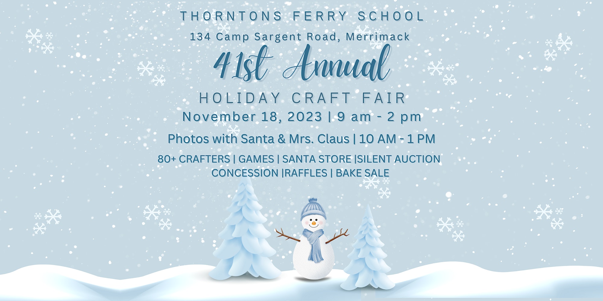Thorntons Ferry School 134 Camp Sargent Road, Merrimack, NH, United StatesPlease join us for the 41st Annual Holiday Craft Fair, presented by the Parents & Teachers of Thorntons Ferry School.This event features 80+ crafters, games, Santa Store, silent auction, concession cafe, raffles, bake sale, and photos with Santa.https://www.pttf-events.com/event/41st-annual-holiday-craft-fair/
